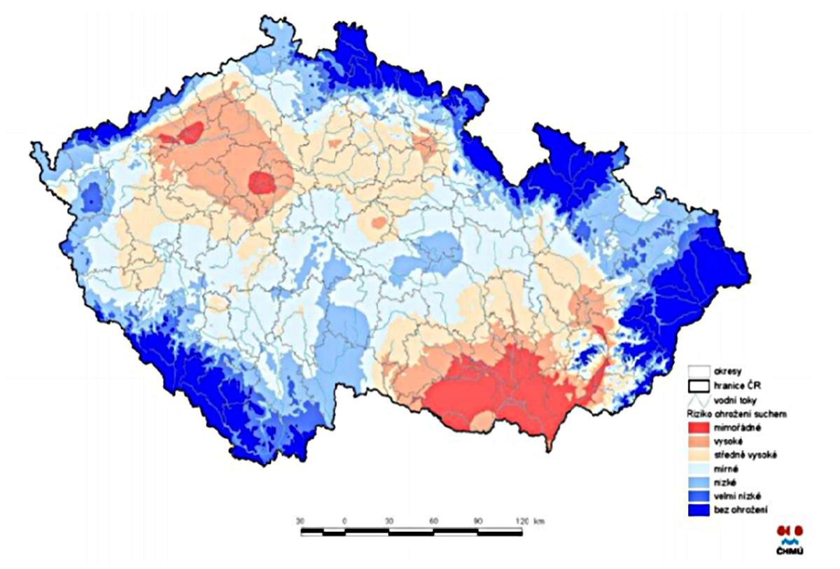 Mapa 2: Oblasti ohrožené suchem (ČHMU, 2012)
