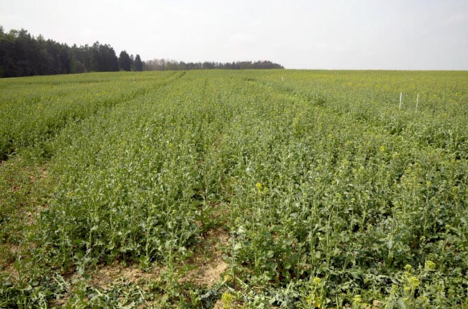Porost řepky ve variantě s mělkým zpracováním půdy, rok 2019 (fáze butonizace)