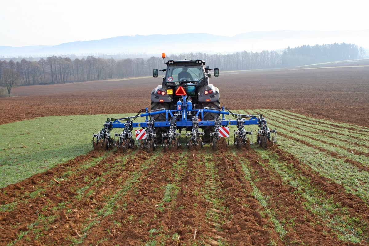 V roce 2017 se začal vyrábět stroj pro pásové zpracování půdy Eco Tiller 600 (obr. 3, 4), který má na jednotku záběru podstatně nižší potřebu tahové síly traktoru, tj. výrazně nižší spotřebu PHM při zachování stejné hloubky zpracování ve srovnání s konvenčním celoplošným zpracováním půdy. Tento stroj je charakterizován masivní konstrukcí nosného rámu a pracovních jednotek, které jsou konstruovány do podmínek s velkým množstvím rostlinných zbytků. Rám umožňuje montáž jednotek s roztečí v rozmezí 45, 70 a 75 cm. Na centrálním rámu je umístěn kompletní hydraulický systém stroje a tříbodový závěs. Zároveň je na rámu dostatek místa k uložení řezací a rozdělovací hlavy pro digestát, resp. kejdu, rozdělovací hlavu pro granulované hnojivo, popřípadě pro zásobník secího stroje. Je možné aplikovat kejdu nebo digestát do tří různých hloubek s odlišnou dávkou, použít minerální hnojiva nebo založit porost v pásech nebo řádcích. V těchto případech je nutné Eco Tiller dovybavit potřebnými komponenty pro danou konkrétní práci. Podrobněji je možné seznámit se s technickými parametry, a také využitím tohoto (ale i obdobných strojů) v publikaci „Pěstování kukuřice seté půdoochrannými technologiemi autorů Menšík, Kincl a kol. z roku 2018.
