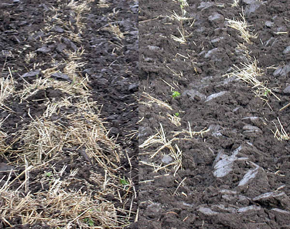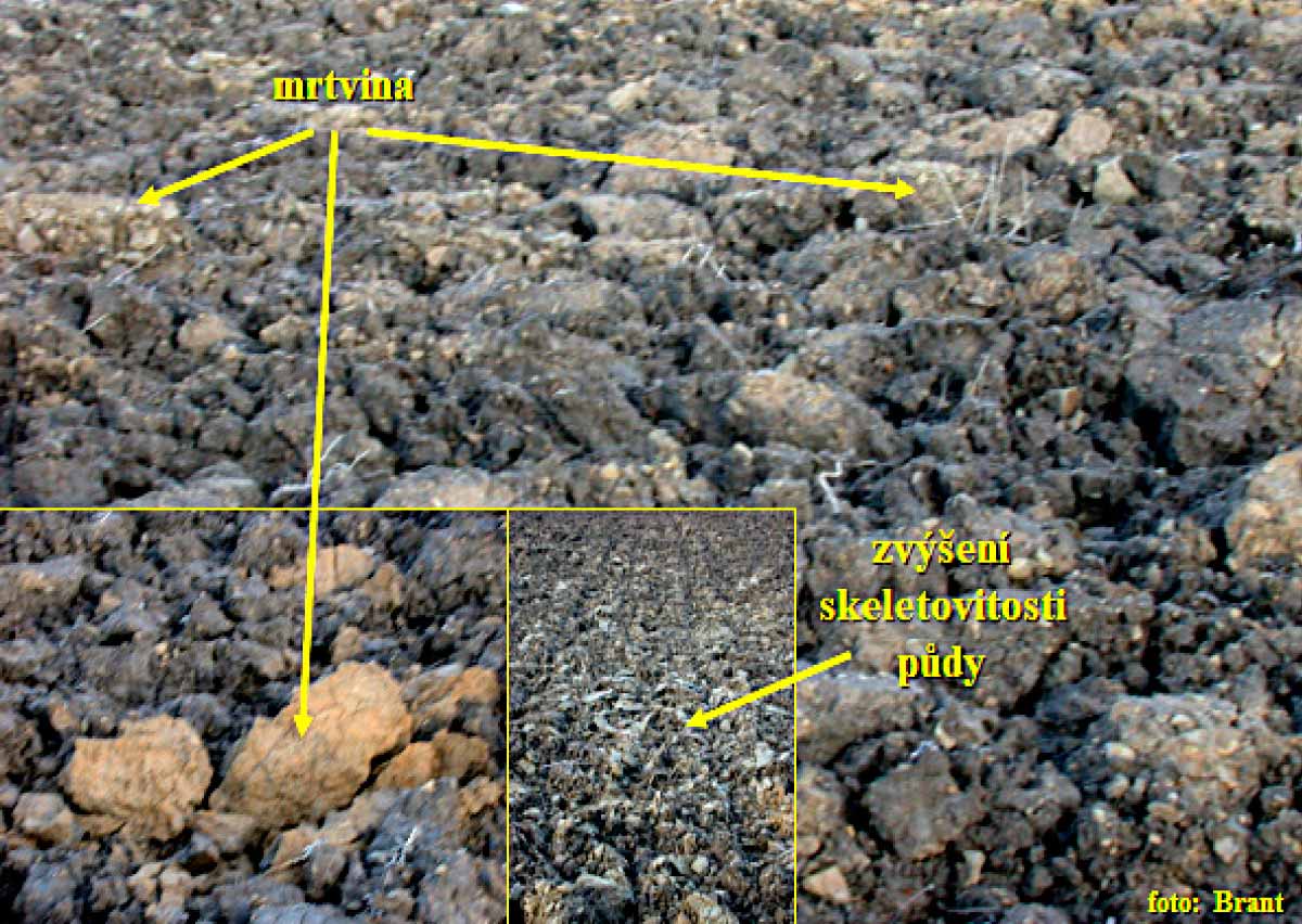 Obr. 1: Nerespektování hloubky ornice vede k vynesení mrtviny z podorničí (vlevo) a zvýšení skeletovitosti (vpravo)