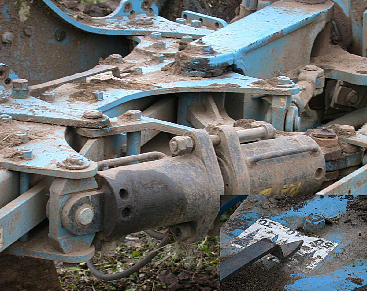 Obr. 5: Díky speciální konstrukci pluhů (tzv. variopluhy) lze během jízdy plynule měnit záběr pluhu, stupnice na rámu pluhu umožňuje traktoristovi nastavit požadovaný záběr (detail)