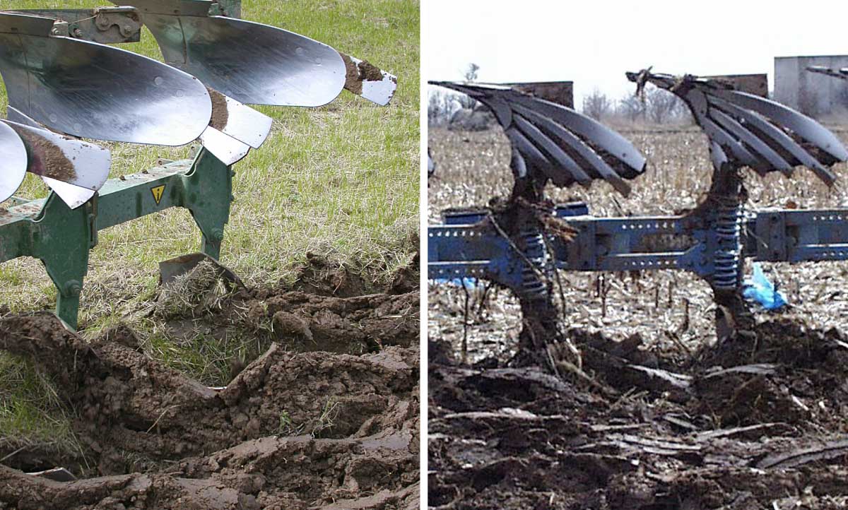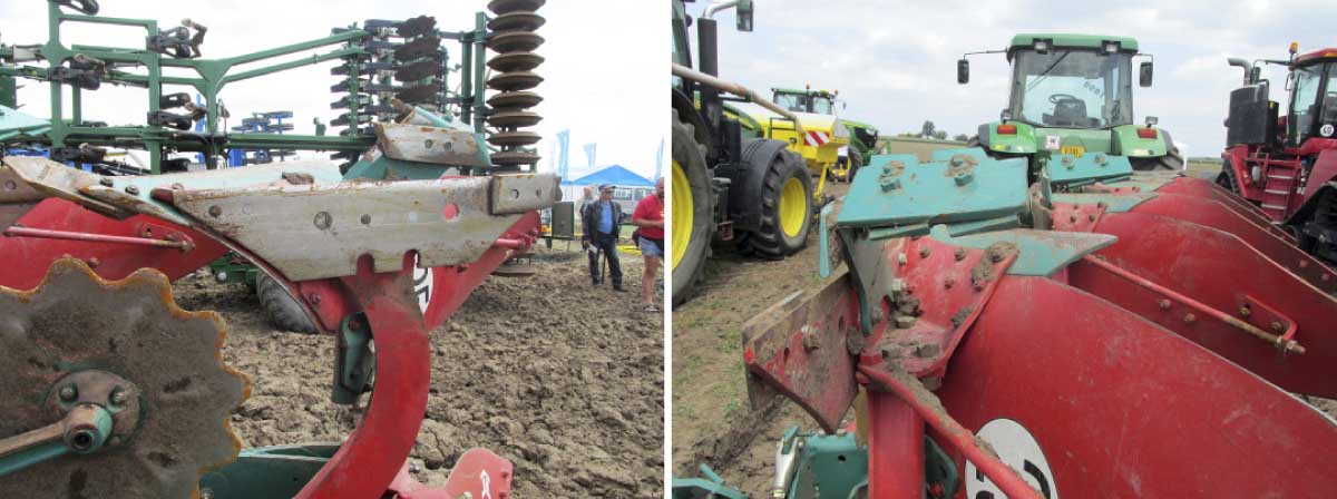 Obr. 2: Orba pomocí orebních těles s plnými odhrnovačkami a střižnou pojistkou (vlevo) a odhrnovačkami páskovými s automatickou pojistkou s tlačnými pružinami (vpravo)