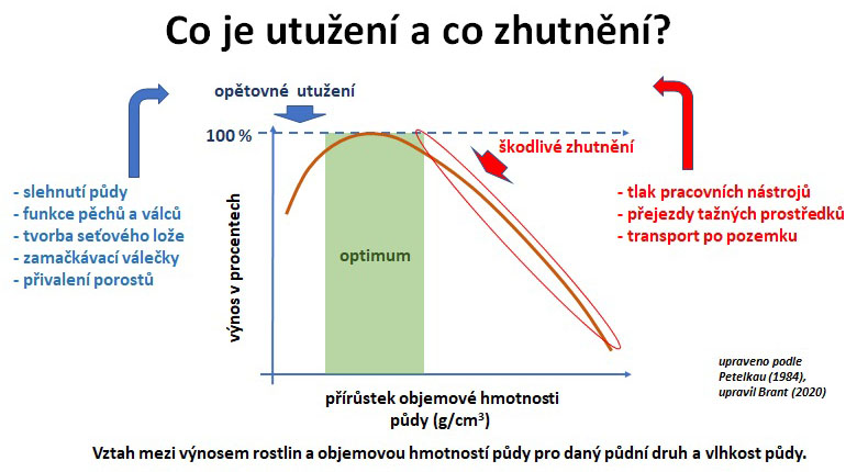 Často je i odbornou veřejností pojem zhutnění zaměňován s pojmem utužení půdy. Procesy spojené s utužováním půdy vedou k optimalizaci prostorového rozmístění půdní hmoty za účelem zajištění vhodných podmínek pro růst kořenů a vývoj nadzemní biomasy porostů. K pozitivnímu utužení půdy dochází při procesu slehávání půdy, při utužení dna seťového lože, při přivalení porostů apod. Zhutněním půdy dochází k negativním změnám prostorového uložení půdní hmoty, včetně snížení pórovitosti, které se projeví nedostatečným provzdušněním půdy, sníženou infiltrační schopností, pomalým ohřevem půdy, špatným růstem kořenů a v neposlední míře i negativním vývojem porostů, včetně poklesu výnosů. Vztah mezi procesem utužení a zhutnění půdy dokládá obrázek 1.