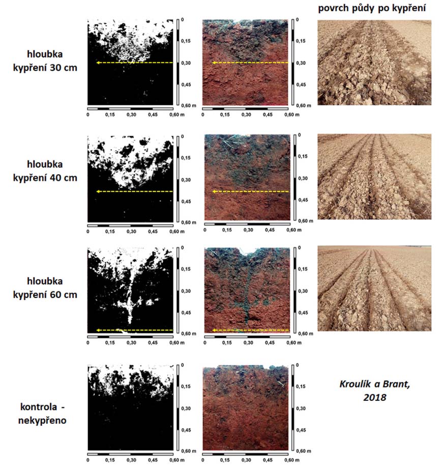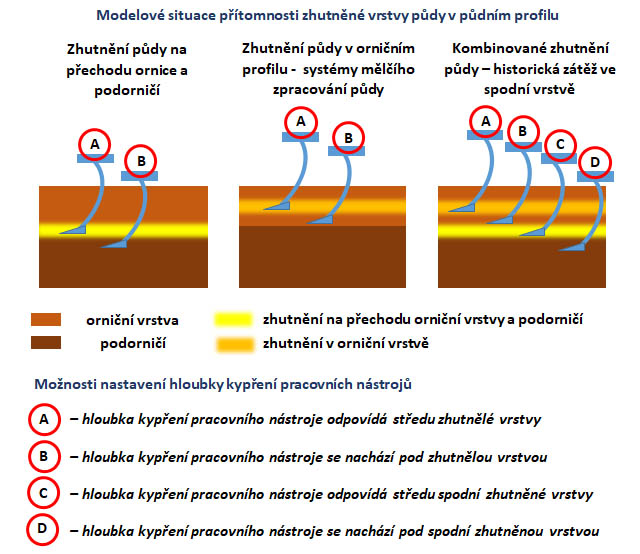 Obrázek 3 dokumentuje nejčastější případy přítomnosti technogenního zhutnění půdy v půdním profilu a možnosti nastavení pracovní hloubky kypřících nástrojů. Technologicky problematické je odstranění více vrstev zhutnění v půdním profilu. Primárně je vhodné začít řešit hlubší zhutnění půdy, a to hlouběji kypřícími nástroji bez vynášecího efektu a se širší roztečí nástrojů. Mezi následnou pracovní operací zpracování půdy a hlubším či hlubokým kypřením je potřebné dodržet proces přirozeného slehnutí půdy. Málo využívanou operací je současný plošný výsev meziplodiny při hlubším kypření.