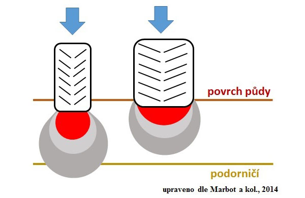 Využití flotačních pneumatik nebo zdvojených pneumatik při předseťové přípravě, ale i při setí, jednoznačně vede ke snížení celkového tlaku traktorů na půdu, narůstá však šířka stopy pneumatiky, a tím i celková přejetá plocha pozemku (Brant a kol., 2016). Snížení tlaku tažných prostředků v důsledku rozložení jejich hmotnosti na půdu jednoznačně eliminuje přenos tlaku do větších hloubek půdy a do podorničí (obr. 2). Nezamezí však utužení orniční vrstvy půdy, zejména při vyšší půdní vlhkosti a při nižší objemové hmotnosti půdy. Zapomínat nelze ani na skutečnost, že k utužení přispívají i samotné pracovní nástroje kypřičů využívaných k předseťové přípravě.