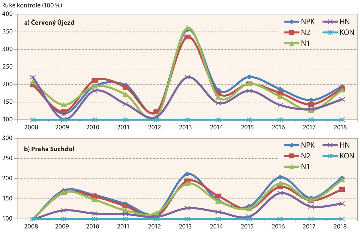 Tyto údaje potvrzují výsledky z našich dlouhodobých polních pokusů ze dvou stanovišť vzdálených jen 15 km od sebe vzdušnou čarou Praha-Suchdol a Červený újezd (okres Kladno). Relativní výnos zrna jarního ječmene na variantách s různými hnojivy se na obou stanovištích v jednotlivých letech většinou liší, a to s ohledem na termín setí, průběh počasí na stanovištích apod. Pro srovnání dat je výnos dlouhodobě nehnojené kontroly na každém stanovišti uveden jako 100 % (graf 3).