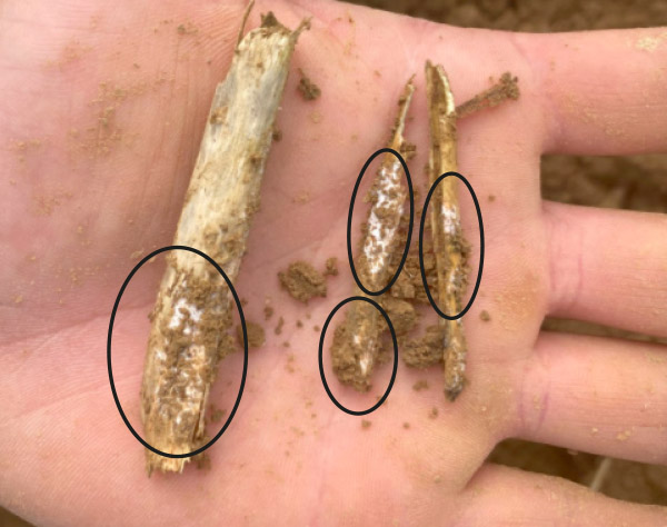 Tyto statisticky průkazné rozdíly jsou potvrzeny i pozorováním v terénu, jak dokládají níže uvedené fotografie, na nichž je vidět, že po aplikaci přípravku Nutrigeo® L se na slámě objevuje podhoubí (bílé části).