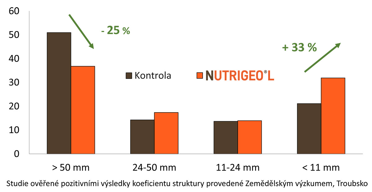 Výsledky studií provedených výzkumnými institucemi ukazují, že díky aplikaci přípravku Nutrigeo® L se snížil podíl hrubých částic a zvýšil podíl jemných drobtů v půdě. Zároveň se snížením zhutnění půdy dochází k jejímu provzdušnění.