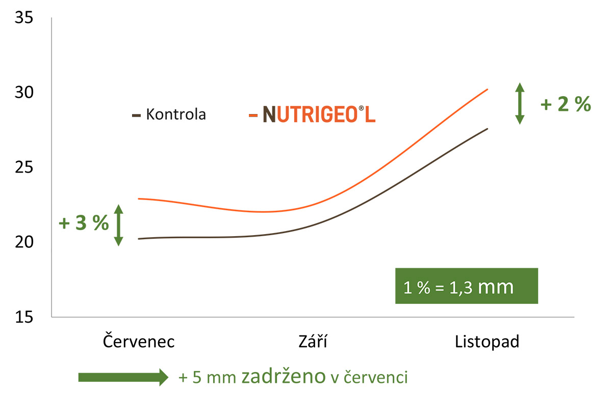 Půda po aplikaci přípravku Nutrigeo® L totiž právě v létě, kdy bývá vody nedostatek, dokáže zadržet o 5 mm více vody než kontrolní vzorek.
