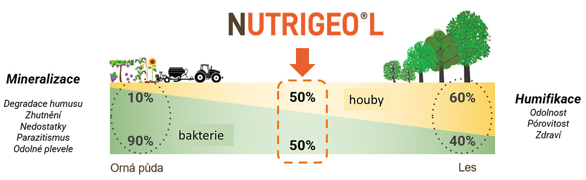 Jedinečné složení přípravku Nutrigeo® L stimuluje činnost hub, které mají na život v půdě pozitivní vliv, a tím umožňuje, aby se půda výše uvedenému poměru přiblížila.