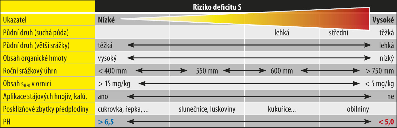 Jedněmi z výsledků, které bývají odlišné, je vliv hnojení sírou na tvorbu výnosu. Je prokázáno, že pokud jsou půdy skutečně deficitní na přístupné formy síry (tj. s obsahem SH2O nižším než 8 mg S/kg půdy), přispívá hnojení sírou ke zvýšení výnosů. Takto nízký obsah síry většinou bývá na půdách lehkých, promyvných, s malým obsahem organické hmoty, bez hnojení stájovými hnojivy a s nízkými vstupy síry v osevním postupu. Naopak na půdách těžších hnojených stájovými hnojivy (nebo čistírenskými kaly), s pravidelnými vstupy síry v hnojivech (zejména v roce před pěstováním ječmene) je výnosová odezva na hnojení sírou poměrně malá. Vliv na mobilitu síranů má i půdní reakce. Predikci potřeby hnojení sírou k jarnímu ječmeni a riziko nedostatku síry můžeme odvodit ze schématu.