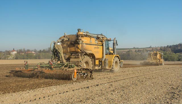 Obr. 1: Aplikace digestátu (24 t/ha) s přídavkem inhibitoru nitrifikace Vizura (2,0 l/ha) na pokusné ploše na podzim 2019; foto: Ing. Jaroslav Domkář; AGRO Posázaví, a. s)
