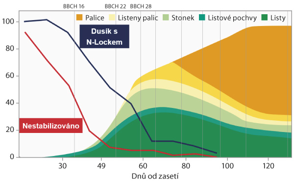 Graf 1: Odběr dusíku jednotlivými částmi kukuřice a vliv použití N-Locku na dostupnost