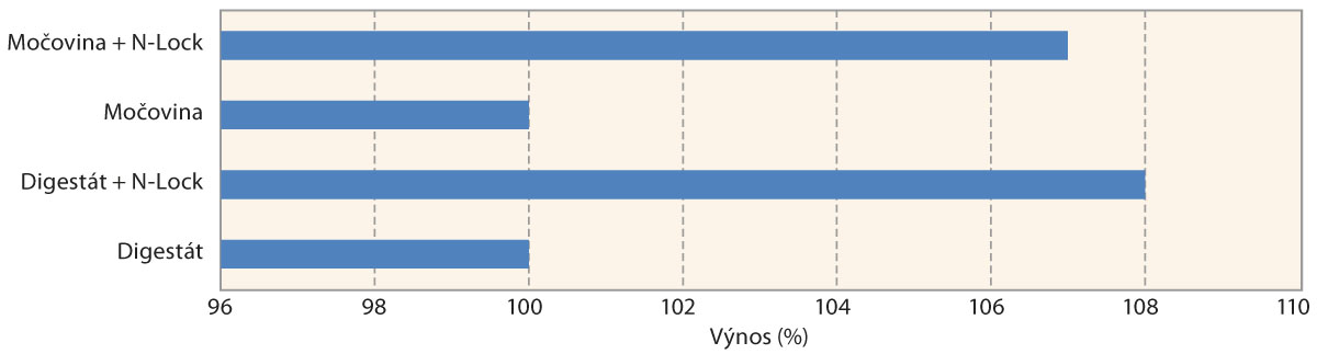 N-Lock je vhodné dostat do půdy. Pouze tak můžeme garantovat jeho jistý účinek. V podstatě to lze dělat dvěma způsoby. Inhibitor se spolu s hnojivem aplikuje ještě před jeho zaoráním (v případě organických hnojiv), anebo je nutné naplánovat jeho plošnou aplikaci před silnějšími dešti. V prvním případě lze N-Lock míchat již přímo v tancích s digestátem (kejdou), popř. vhodným způsobem smíchat při plnění tekutých organických hnojiv do cisterny (by-pass technologie). Pochopitelně lze N-Lock aplikovat postřikovačem na hnojivo před jeho zapravením. Druhou možností je N-Lock přidat k preemergetním nebo časně postmergentním aplikacím herbicidů ať už v aplikaci s DAMem či bez něj. Následovat by ale měly srážky (alespoň 10 mm během 12 dnů). Účelnost těchto aplikací potvrzují pokusy ze zkušební stanice v Krásném Údolí (graf 4).