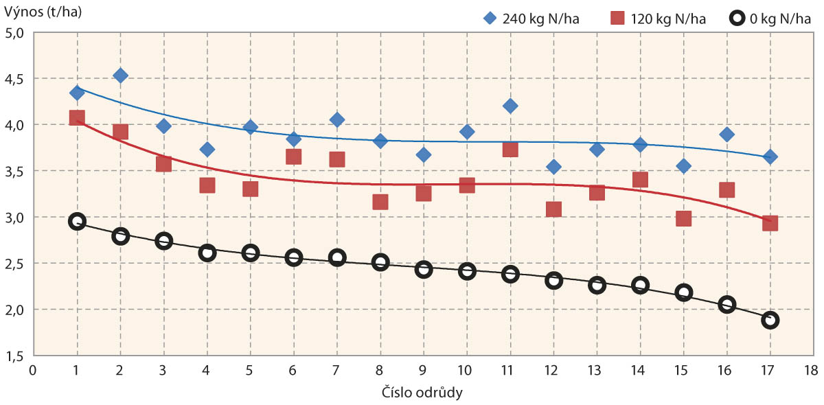 V posledním desetiletí dochází ke zvyšování výnosu nejen vlivem nových odrůd (hybridů, linií), ale i úpravou technologií pěstování a vstupů. Na hnojení dusíkem však mohou pěstované odrůdy reagovat odlišně. Jak je patrné z tabulky 2 a grafu 1, při pěstování sedmnácti odrůd bez hnojení dusíkem (0 kg N/ha) byly stanoveny značné rozdíly ve výnosech, tj. schopnosti odrůd využít „pouze“ minerální dusík z půdy. Avšak při dodání dusíku v hnojivech se rozdíly mezi odrůdami snižovaly, přičemž některé odrůdy vlivem hnojení „změnily pořadí“ výnosu semen. U výsledků nejsou uvedeny názvy odrůd, jelikož výsledky pokusu jsou z let 2008–2010 a hodnocené odrůdy již v sortimentu nenajdeme. Musíme však počítat, že obdobně se chovají i novější odrůdy.