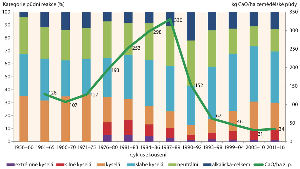 Půdní reakce se v orných půdách pohybuje od 5,9 do 6,8 pH. Vývoj výměnné půdní reakce nemá již tak negativní trend, jako tomu bylo mezi lety 1995–2005, který vedl k prudkému okyselování zemědělské půdy. Průměrná hodnota půdní reakce v odběrovém cyklu 2011–2016 na orných půdách je 6,2 pH, přičemž součet podílu silně kyselých a kyselých půd je 26,11 % (tab. 1). Největší podíl kyselých orných půd se nachází v kraji Karlovarském (55,4 %), Jihočeském (50,6 %), následuje kraj Vysočina (48,3 %) a kraj Jihočeský (44,5 %).