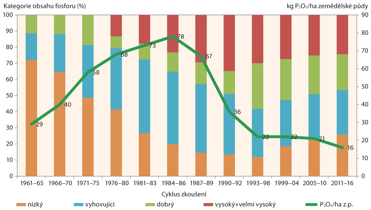 Průměrný obsah přístupného fosforu na orné půdě se pohybuje v rozmezí od 72 do 130 mg/kg a ve dvou odběrových cyklech zkoušení nedošlo ke změně průměrného obsahu přístupného P (90 mg/kg). Podíl orných půd s nízkým obsahem fosforu tvoří téměř 26,51 %, které je potřeba hnojit (tab. 2). Vysoký a velmi vysoký obsah je zastoupen na 24,64 % výměry. V regionech byl zjištěn největší podíl ploch s nízkým obsahem fosforu v kraji Karlovarském (43,1 %) a Plzeňském (42,3 %), následuje kraj Zlínský (30,8 %). Naopak největší podíl půd s vysokým a velmi vysokým obsahem fosforu má kraj Liberecký (50,36 %), Vysočina 30,82 % a Ústecký (29,24 %).