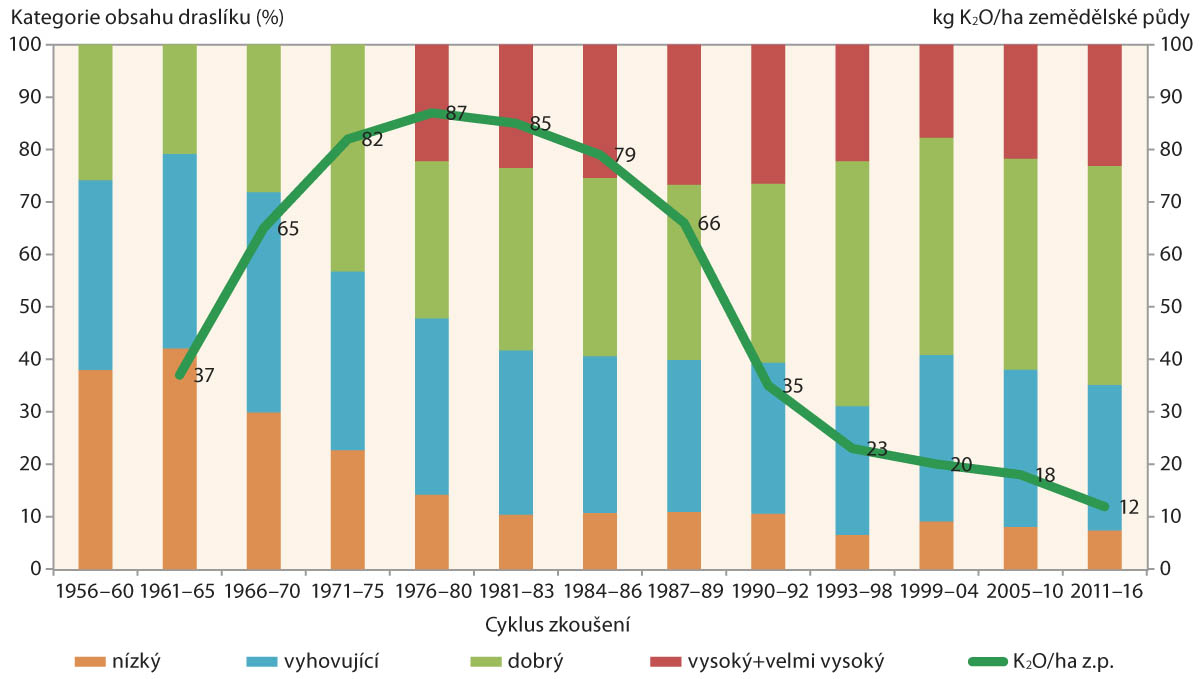 Obsah přístupného draslíku v orných půdách ČR je v rozmezí od 191 do 454 mg/kg, ve srovnání s minulým cyklem zkoušení se zásoba zvýšila o 13 mg/kg a činí v průměru 253 mg/kg. Zemědělská půda s nízkou zásobou draslíku, která potřebuje intenzivní hnojení, představuje 7,4 % výměry, vyhovující zásoba, která také potřebuje mírné dosycení touto živinou, dalších 27,8 % výměry. Naopak vysoká a velmi vysoká zásoba draslíku byla zjištěna na 23 % výměry. Přehled průměrných hodnot přístupného draslíku a podíl půd s nízkou, vysokou a velmi vysokou zásobou za územně správní celky a ČR je uveden v tabulce 3.