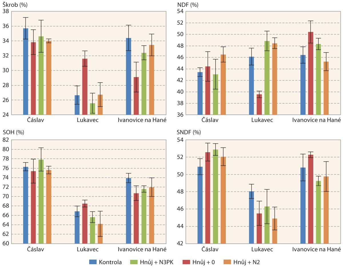 Na lokalitě Lukavec byly zároveň zjištěny i nejnižší hodnoty SOH a SNDF (patrně vliv pro kukuřici méně příznivých půdně-klimatických podmínek). V hnojených variantách byly stanoveny nižší obsahy škrobu než na kontrole (výjimkou je varianta Hnůj + 0 na stanovišti Lukavec). Obsah NDF v hnojených variantách na většině lokalit byl vyšší než na kontrole (výjimkou je varianta Hnůj + 0 na stanovišti Lukavec). SOH v hnojených variantách na většině lokalit byl nižší než na kontrole (výjimkou je varianta Hnůj + N3PK na stanovišti Čáslav a varianta Hnůj + 0 na stanovišti Lukavec). Vyšší obsah SNDF v rámci všech variant byl zaznamenán na lokalitách Čáslav a Ivanovice na H.