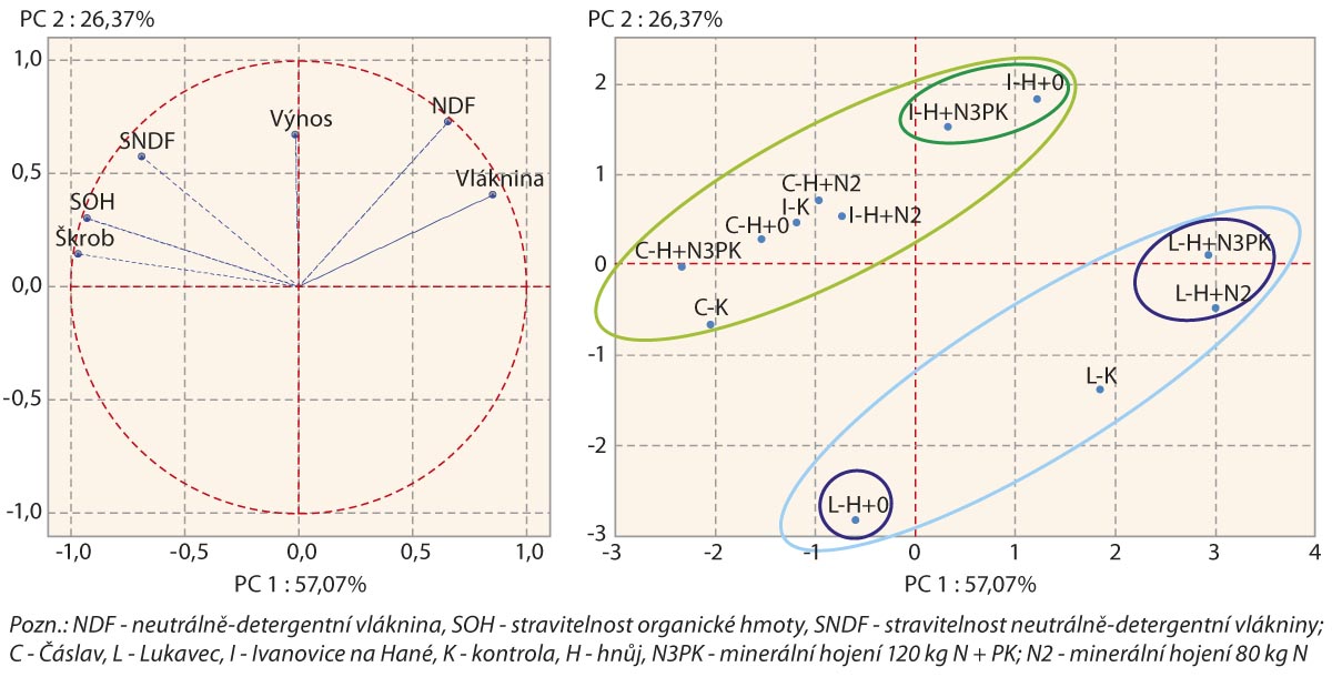 V rozptylovém diagramu komponentního skóre (graf 4 vpravo) jsou podél osy PC1 rozdělené jednoznačně lokality a varianty hojení z pohledu obsahu škrobu, SOH a vlákniny a dále jsou podle osy PC2 odlišeny varianty podle NDF a výnosu sušiny.