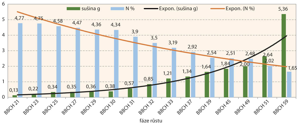 Proto, abychom to mohli provést, je nutné provádět odběr vzorku zeminy na stanovení Nmin před setím a odběry vzorků rostlin 2× během vegetace, přičemž první odběr by měl být směřován na první polovinu odnožování (BBCH 21–27) a druhý na počátek sloupkování (BBCH 30–34). V rámci odběru stanovíme hmotnost sušiny 1 rostliny a v sušině obsah dusíku a ostatních živin. Rozhodující v těchto obdobích je především dostatečné zásobení rostlin dusíkem, samozřejmě vyhodnotíme i obsah ostatních živin. Z grafu 1 je patrná dynamika odběru dusíku během vegetace. Jedná se o průměrné čerpání N stanovené na základě našich pětiletých pokusů.