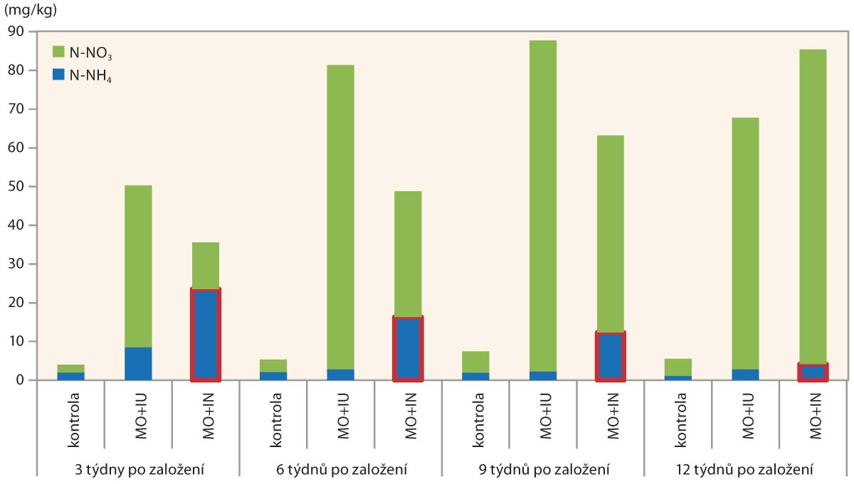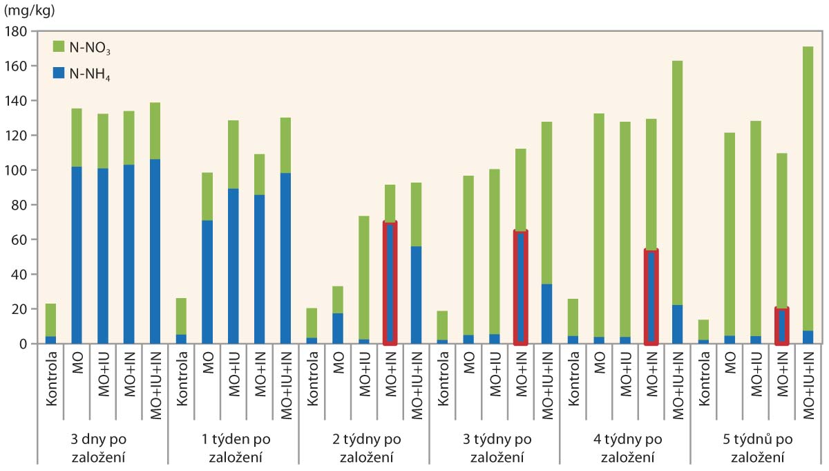 Pro porovnání efektu inhibitorů nitrifikace a ureázy byl na Mendelově univerzitě v Brně byl v roce 2007 založen nádobový pokus v řízených podmínkách klimaboxu. Pokus byl založen ve třech variantách, a to kontrola, močovina s inhibitorem ureázy (MO + IU) a močovina s inhibitorem nitrifikace (MO + IN). Dávka hnojiv odpovídala dávce 110 kg N/ha. V pravidelných třítýdenních intervalech (3, 6, 9 a 12 týdnů po založení) byly odebírány vzorky zeminy pro stanovení obsahu minerálního dusíku (mg/kg). Zjištěná množství dusíku v jednotlivých odběrech jsou znázorněna v grafu 1. Z výsledků je patrné, že u močoviny s inhibitorem nitrifikace bylo ještě po 9 týdnech od aplikace 6× více dusíku v amonné formě v porovnání s variantou s inhibitorem ureázy.