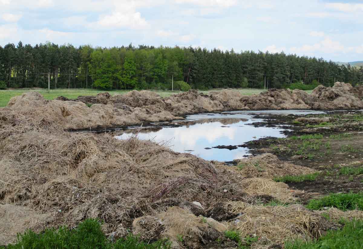 Únik hnojůvky z polního hnojiště. Vlivem intenzivních dešťových srážek došlo k nadměrnému úniku hnojůvky a tvorbě lagun. (O. Venerová)