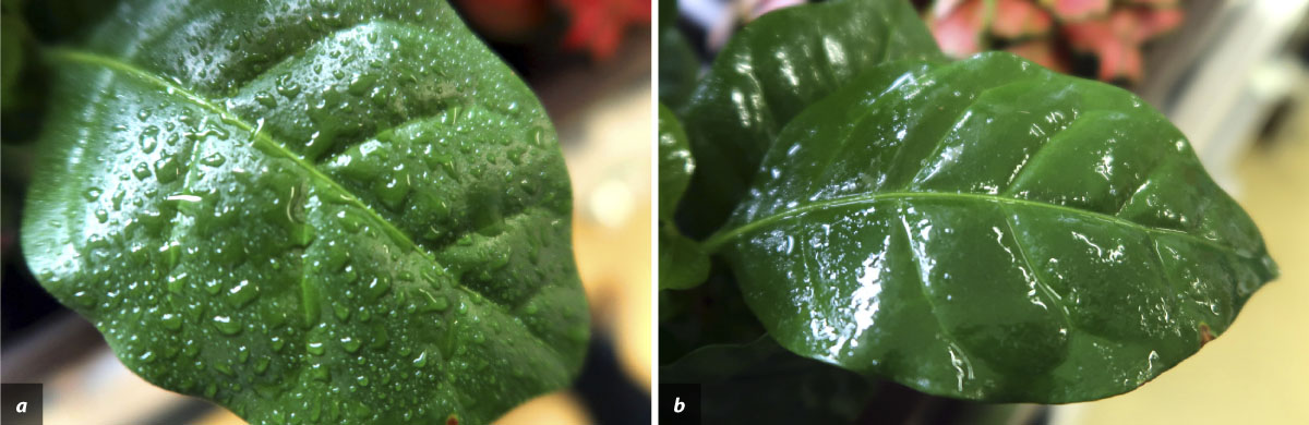 Obr. 2: Vliv vlastností roztoku na přilnutí k povrchu, a - roztok, b - roztok se smáčedlem