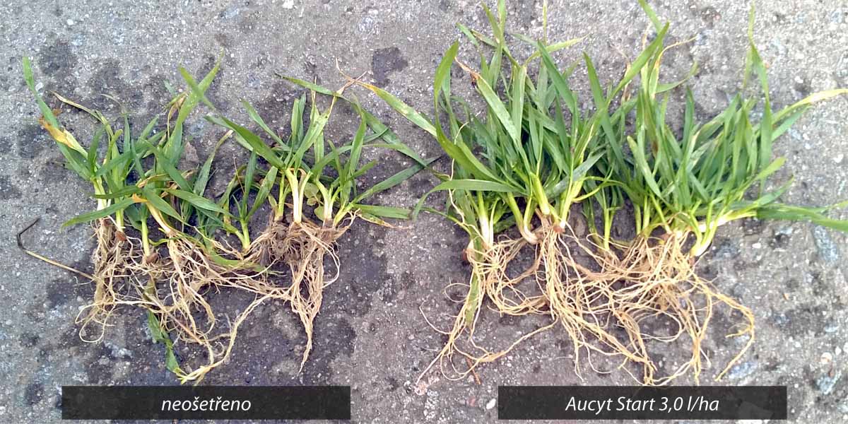 Přípravek Aucyt Start zařazený mezi pomocné rostlinné přípravky doporučujeme k tomuto účelu u ozimých obilnin použít především ihned po otevření jarní vegetace v rámci regenerace v době první poloviny odnožování BBCH 21–25). Aucyt Start se používá v dávce 2,0 až 3,0 l/ha a lze jej kombinovat s jakýmkoliv dalším pesticidem nebo použít i samostatně, protože jde o komplexní vyvážený přípravek použitelný i za nižších teplot. Právě dlouhodobý účinek umožňuje využití přípravku časně, při prvním jarním vstupu do porostu, kdy ostatní použitelné přípravky omezují především teploty. Aucyt Start je také vhodnou alternativou podpory odnožování již na podzim u časnějších setí například v kombinaci s herbicidy nebo insekticidy. Využitelný je i v rámci podzimní či jarní regulace řepky. V tabulce jsou uvedeny výsledky použití přípravku Aucyt Start v pšenici ozimé. Přiložený obrázek ukazuje vliv podzimní aplikace Aucyt Start v dávce 3,0 l/ha v roce 2017.