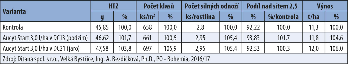 Tab.: Výsledky použití přípravku Aucyt Start v pšenici ozimé v roce 2017