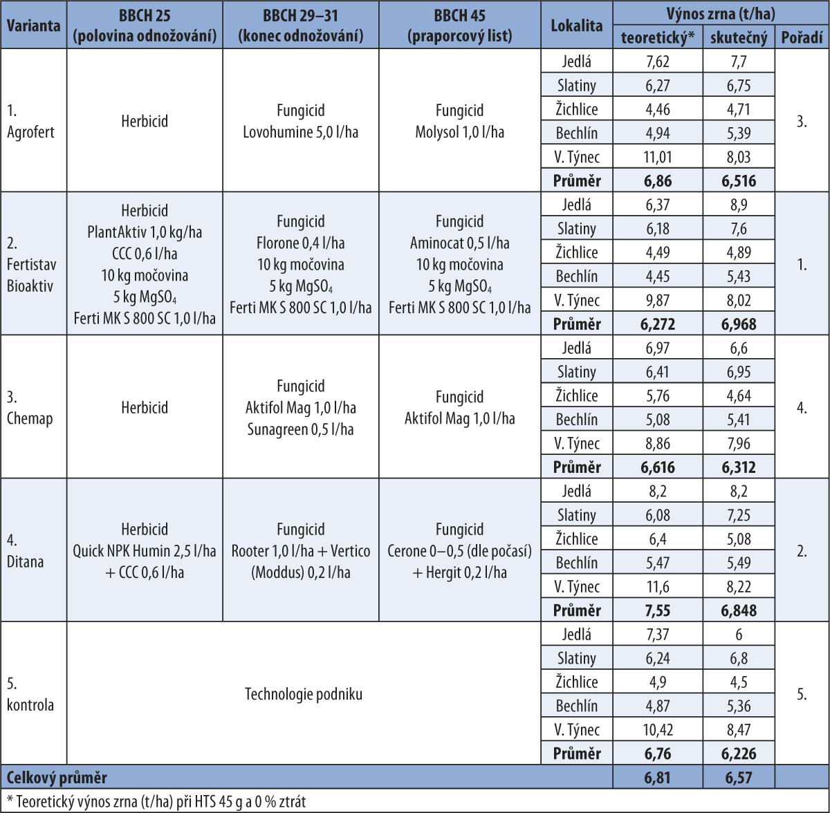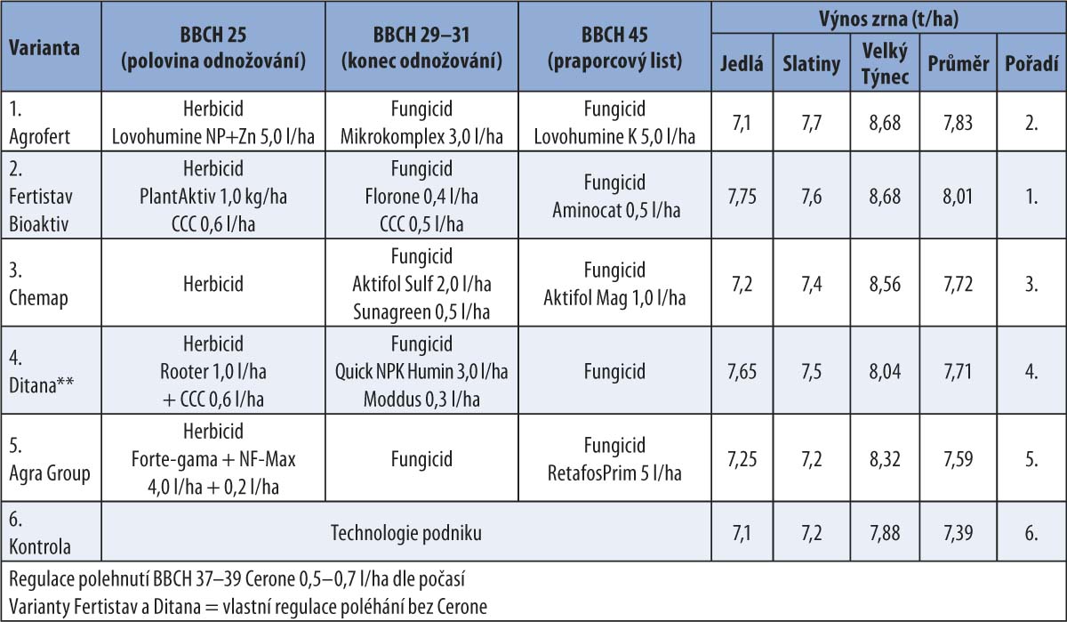 Nejvýnosnější variantou v podniku Vrcha Jedlá a Dynín byla var. 2 (polovina odnožování Plant Aktiv 1,0 l/ha + konec odnožování Aminocat 0,3 l/ha + Florone 0,3 l/ha).