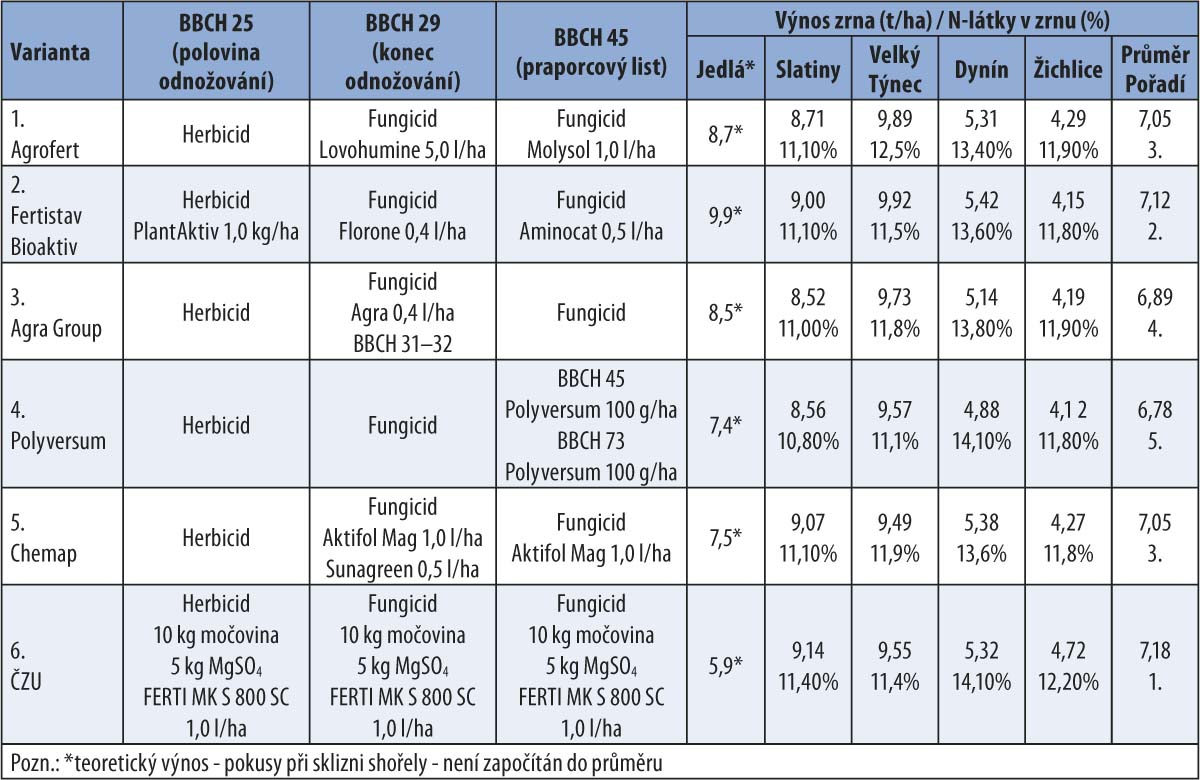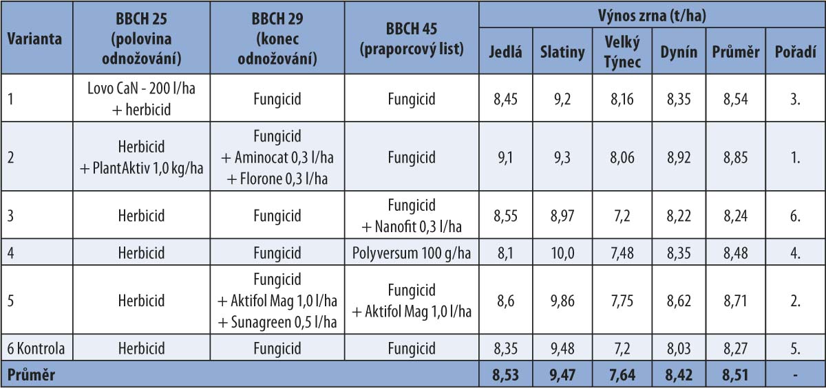 V Agro Slatiny byla nejvýnosnější var. 4, která nahradila druhé fungicidní ošetření aplikací Polyversum 100 g/ha a Velkém Týnci byla nejvýnosnější varianta po aplikaci LovoCaN 200 l/ha v polovině odnožování. Přihnojením LovoCaNem na list v polovině odnožování zvyšovalo výnos a je jedním z intenzifikačních faktorů stabilizujících sladovnickou kvalitu v srážkově optimálním nebo nadprůměrném ročníku. Při suchém průběhu jara může tato výhoda se stát nevýhodou a zvyšovat obsah N-látek v zrnu mimo sladovnickou kvalitu.