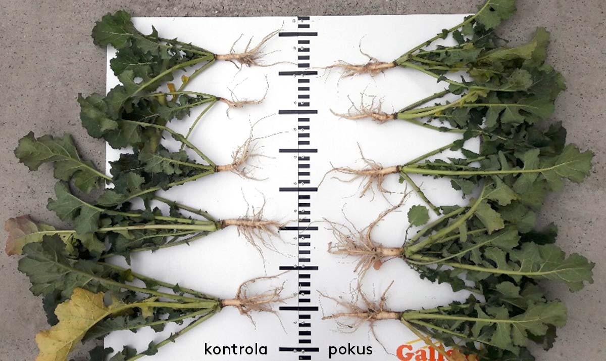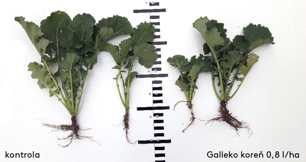 Jedným z výskumných ústavov, kde sa už niekoľko rokov potvrdzuje prínos pokusného variantu ošetrenia prípravkami Galleko je aj NPPC – VÚRV Piešťany. Pokusy tri roky po sebe prebiehali v lokalite Borovce (nadmorská výška 160 m n. m.). Sledovaný pokusný variant pozostával z dvoch ošetrení. V prvom sa použil prípravok Galleko koreň v jeseni v dávke 0,8 /ha. Vďaka jeho účinkom už niekoľko dní po aplikácii, môžeme vidieť dlhší, mohutnejší koreň s množstvom koreňových vlásočníc, hrubším koreňovým krčkom a vyššiu vitalita ošetreného porastu. Na obr. 1 sú jedince z pokusného a kontrolného variantu . Jedince sa vyberali podľa veľkosti nadzemnej časti. Rozdiely v nadzemnej časti rastlín medzi pokusným a kontrolným variantom neboli náhodné. Zámerne sme vyberali jedince menšieho vzrastu z ošetreného variantu a porovnávali s jedincami vyššieho vzrastu z kontrolného variantu.