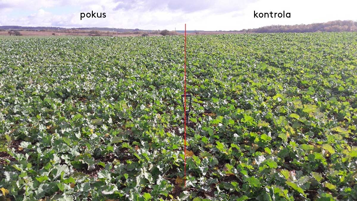Obr. 7: Stav rastlín repky ozimnej 7. 11. 2017, odroda DK Exception, Zemědělské družstvo Svojetín, vľavo kontrola, vpravo Galleko koreň 0,8 l/ha