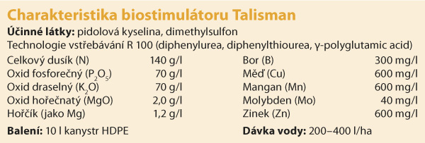 Talisman skutečně pomáhá rostlinám prosperovat. Představuje účinnou pomoc při překonávání negativních důsledků působení abiotického stresu na zdraví a výživovou kondici plodin. Překvapí i dostupnou cenou, která umožní pěstiteli provést na svých polích tak nejen ozdravný, ale i vysoce profitabilní pěstební zásah. Spokojenost tedy zavládne nejen v rostlinné říši.