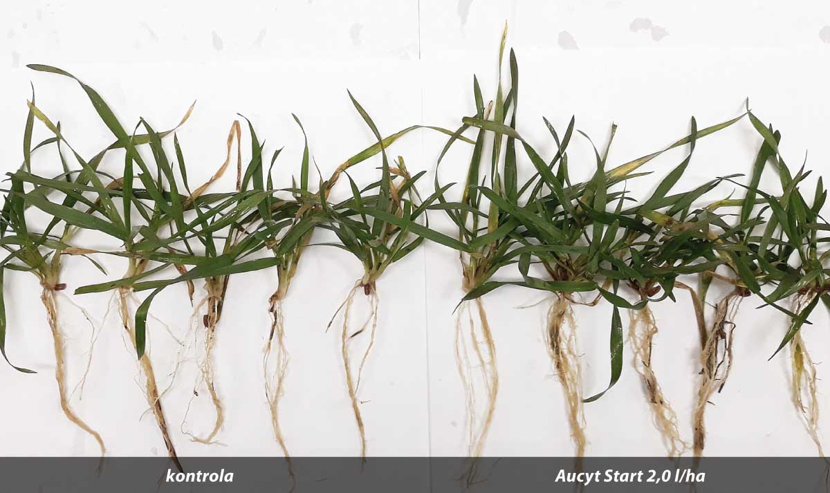 Aplikace cytokininového přípravku Aucyt Start (dávka 3,0 l/ha), byla provedena ve formě podzimního i jarního ošetření. Výnosově, se jeví jako vhodnější jarní aplikace (105,2 proti 104,2 % na kontrolu). Velmi důležitým přínosem podzimní aplikace, je však silná podpora produktivních odnoží a kořenů již v podzimním období. Tyto odnože, pak v případě jarního sucha, nejsou nijak „ohroženy“ a tvoří základ, pro dostatečnou hustotu rostlin a následný výnos. Ze získaných dat v tabulce 1. vyplývá, že podzimní aplikace výrazněji zvýšila počet středních a silných odnoží. Nedošlo však k žádnému navýšení těch neproduktivních. Jarní ošetření naopak výrazněji zvýšilo počet produktivních odnoží, stejně jako těch středních, počet neproduktivních zůstal beze změny. V obou případech se toto pozitivně promítlo do zahuštění porostu o 5,2 a 7,2 %. Důležité bylo, že podpora odnožování po aplikaci Aucytu Start, neprobíhala nekontrolovaně a nedošlo k masivnímu vývoji neproduktivních odnoží, které by oslabovaly rostliny a snižovaly výnos. Absolutní rozdíl v nárůstu výnosu zrna, byl např. v roce 2020 u podzimní a jarní aplikace Aucytu Start 845 kg a 882 kg zrna/ha.