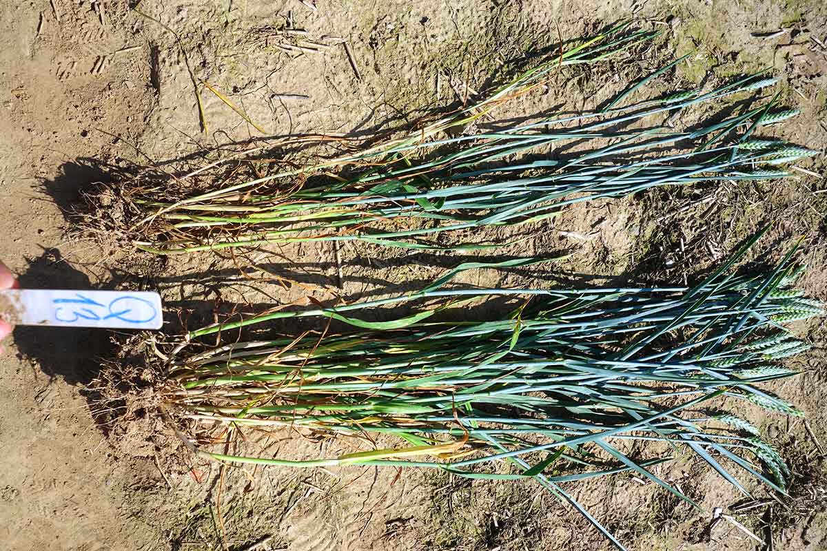 Obr. 5: Vliv aplikace Atonik, resp. Asahi 0,6 l/ha v BBCH 30–31 v ozimé pšenici na kořeny, odnože a klasy; neošetřená kontrola je vlevo (odrůda RGT Reform, Ditana 11. 6. 2019)